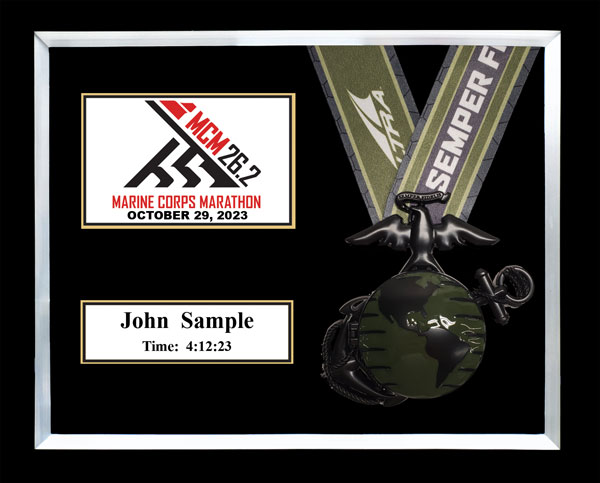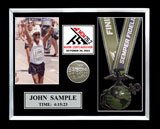 Includes an additional finisher's medal, event logo plate, pewter disc of runners, engraved plate with name and chip time, mat opening for a 5' x 7' photo. (Triathlon / Ironman products will include split times, a disc of the triathlon symbol, and course maps.)