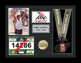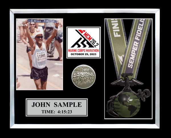 Includes an additional finisher's medal, event logo plate, pewter disc of runners, engraved plate with name and chip time, laminated replica of your bib number, mat opening for a 5' x 7' photo. (Triathlon / Ironman products will include split times, a disc of the triathlon symbol, and course maps.)