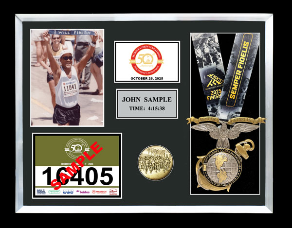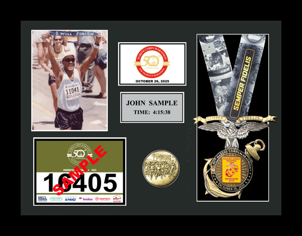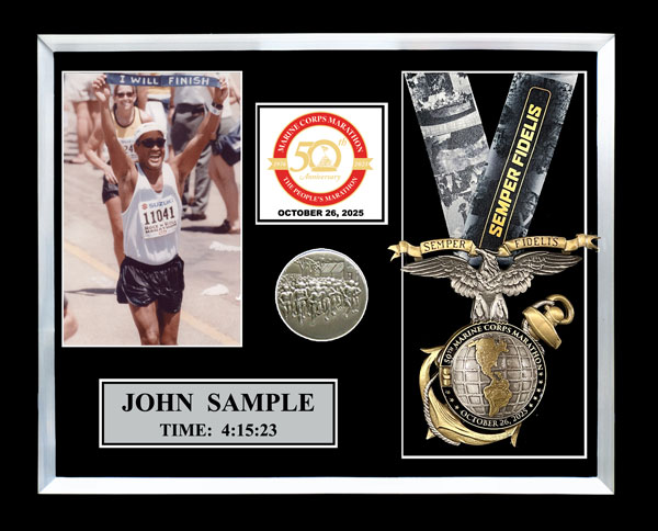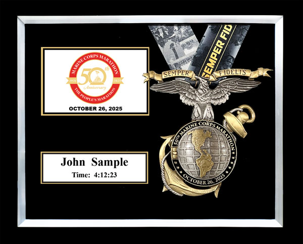 Includes an additional finisher's medal, event logo plate, pewter disc of runners, engraved plate with name and chip time, laminated replica of your bib number, mat opening for a 5' x 7' photo. (Triathlon / Ironman products will include split times, a disc of the triathlon symbol, and course maps.)