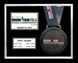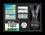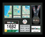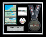 Includes an additional finisher's medal, event logo plate, pewter disc of runners, engraved plate with name and chip time, laminated replica of your bib number, mat opening for a 5' x 7' photo. (Triathlon / Ironman products will include split times, a disc of the triathlon symbol, and course maps.)