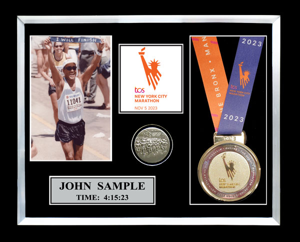 Includes an additional finisher's medal, event logo plate, Official New York Road Runners logo, engraved plate with name and chip time, laminated replica of your bib number, mat opening for a 5' x 7' photo.
