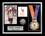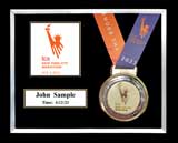 Includes an additional finisher's medal, event logo plate, pewter disc of runners, engraved plate with name and chip time, mat opening for a 5' x 7' photo.