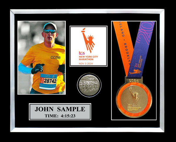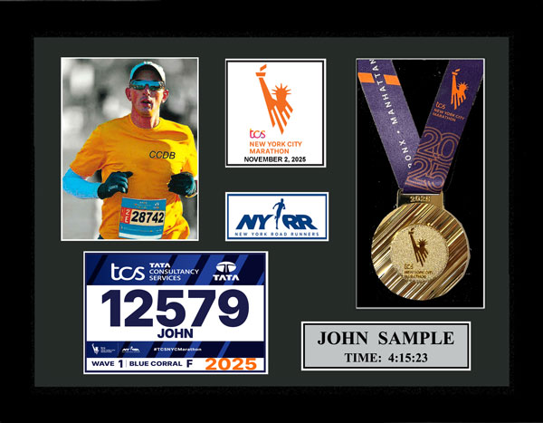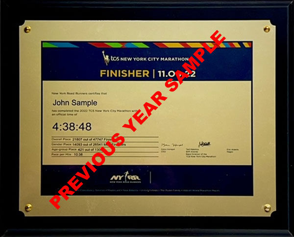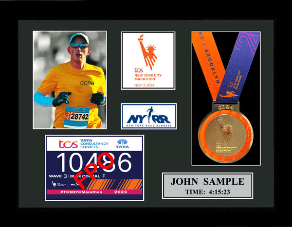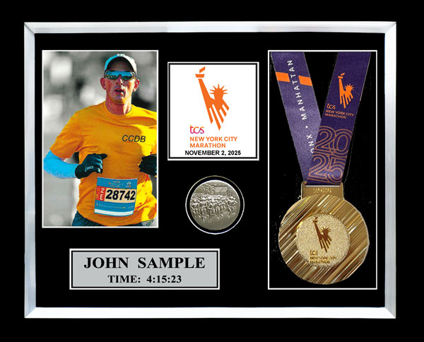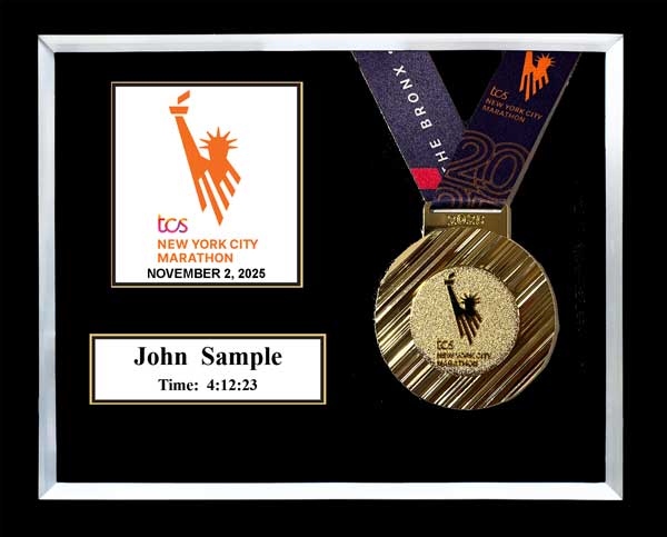 Includes an additional finisher's medal, event logo plate, Official New York Road Runners logo, engraved plate with name and chip time, laminated replica of your bib number, mat opening for a 5' x 7' photo.