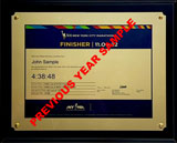 Goldtone metal wooden plaque, Finisher's Certificate duplicated in color on metal with race statistics and logo, mounted on a black wooden plaque. (Also available in walnut color wood).