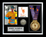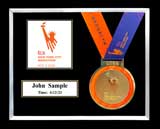 Includes an additional finisher's medal, event logo plate, pewter disc of runners, engraved plate with name and chip time, mat opening for a 5' x 7' photo.