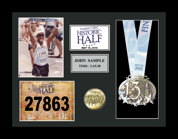 Includes an additional finisher's medal, event logo plate, pewter disc of runners, engraved plate with name and chip time, laminated replica of your bib number, mat opening for a 5' x 7' photo. (Triathlon / Ironman products will include split times, a disc of the triathlon symbol, and course maps.)