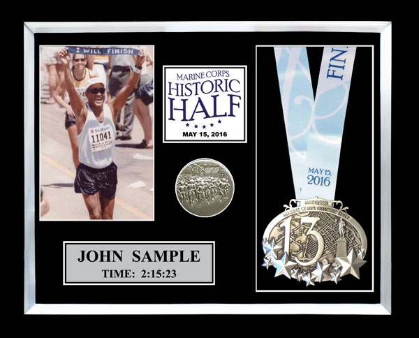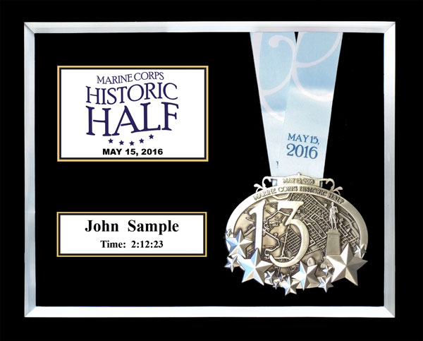 Includes an additional finisher's medal, event logo plate, pewter disc of runners, engraved plate with name and chip time, mat opening for a 5' x 7' photo. (Triathlon / Ironman products will include split times, a disc of the triathlon symbol, and course maps.)