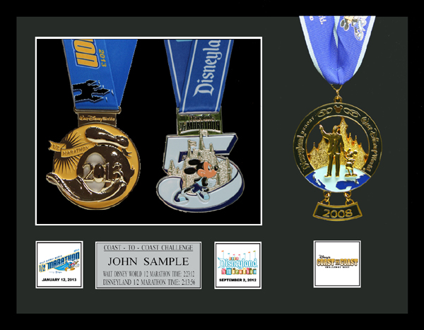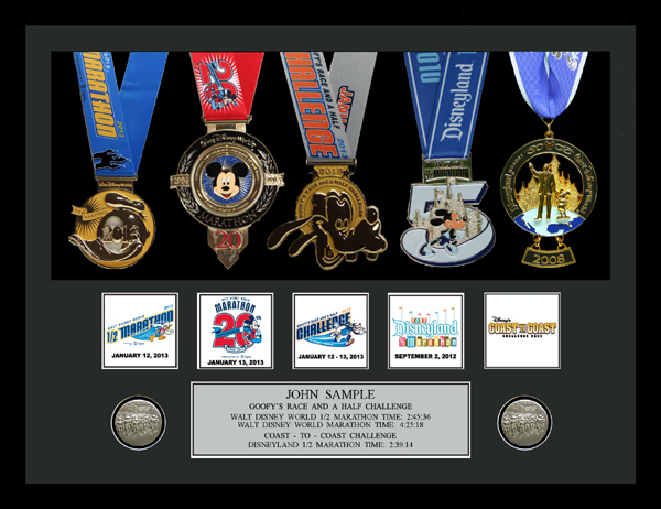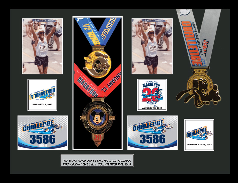 Matted black wooden frame, Includes additional finisher's medals, event logo plates, engraved plate with name and chip times, laminated replicas of your bib numbers, mat openings for 5" x 7" photos.