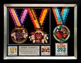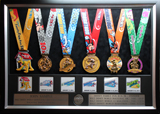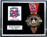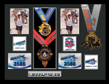 Matted black wooden shadow box, Includes additional finisher's medals, event logo plates, laminated replica of your bib number, engraved plate with name and chip times.
