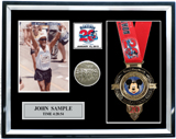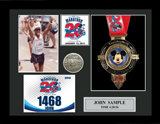 Includes an additional finisher's medal, event logo plate, pewter disc of runners, engraved plate with name and chip time, laminated replica of your bib number, mat opening for a 5' x 7' photo. (Triathlon / Ironman products will include split times, a disc of the triathlon symbol, and course maps.)