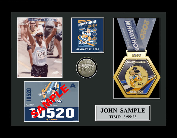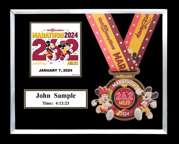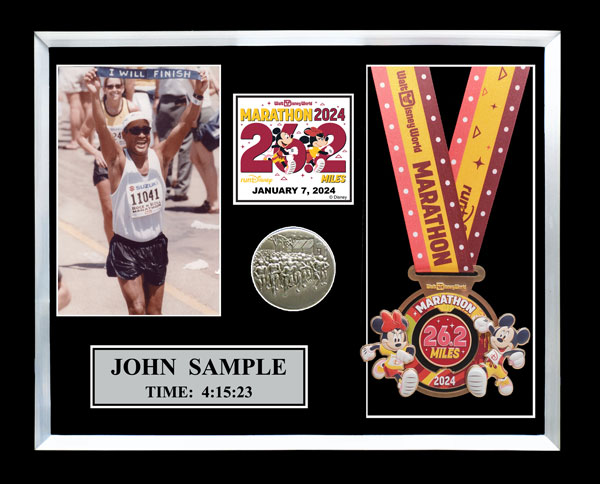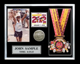 Includes an additional finisher's medal, event logo plate, pewter disc of runners, engraved plate with name and chip time, mat opening for a 5' x 7' photo. (Triathlon / Ironman products will include split times, a disc of the triathlon symbol, and course maps.)