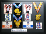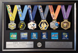 Matted black wooden shadow box, Includes additional finisher's medals, event logo plates, engraved plate with name and chip times.