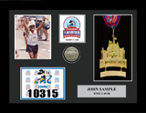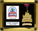 Includes an additional finisher's medal, event logo plate, pewter disc of runners, engraved plate with name and chip time, laminated replica of your bib number, mat opening for a 5' x 7' photo. (Triathlon / Ironman products will include split times, a disc of the triathlon symbol, and course maps.)