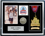 Includes an additional finisher's medal, event logo plate, pewter disc of runners, engraved plate with name and chip time, mat opening for a 5' x 7' photo. (Triathlon / Ironman products will include split times, a disc of the triathlon symbol, and course maps.)
