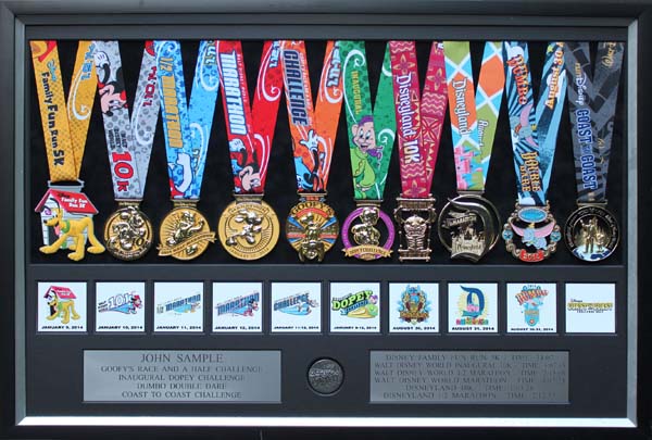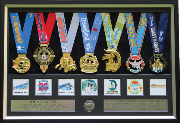 Matted black wooden shadow box. Includes additional finisher's medals, event logo plates, engraved plate with name and chip times.