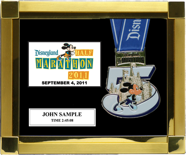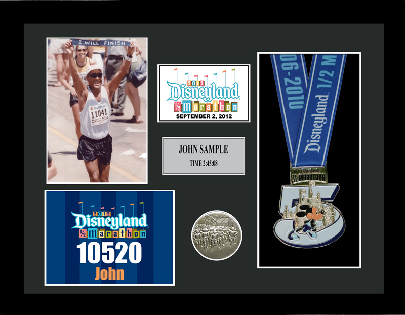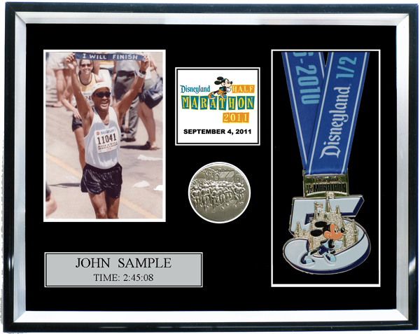Includes an additional finisher's medal, event logo plate, pewter disc of runners, engraved plate with name and chip time, mat opening for a 5' x 7' photo. (Triathlon / Ironman products will include split times, a disc of the triathlon symbol, and course maps.)