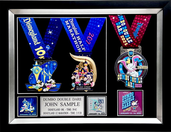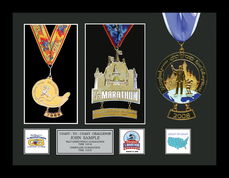 Matted black wooden shadow box, Includes additional finisher's medals, event logo plates, engraved plate with name and chip times.